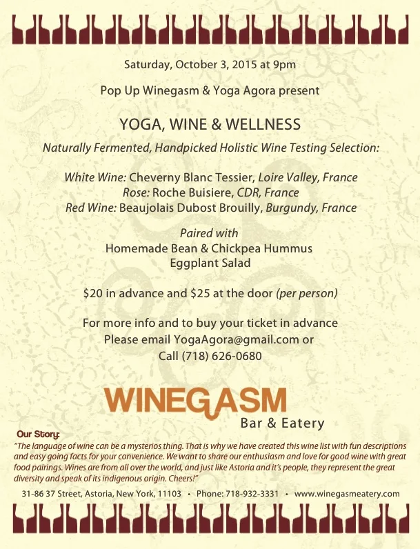 This event will focus on wine culture and wine specifically chosen for yogis, meaning wines that are small production and made with a lot of TLC - handpicked, naturally fermented, minimal use of sulfur (what gives you headache the next day), organic, bio-dynamic and even vegan friendly.